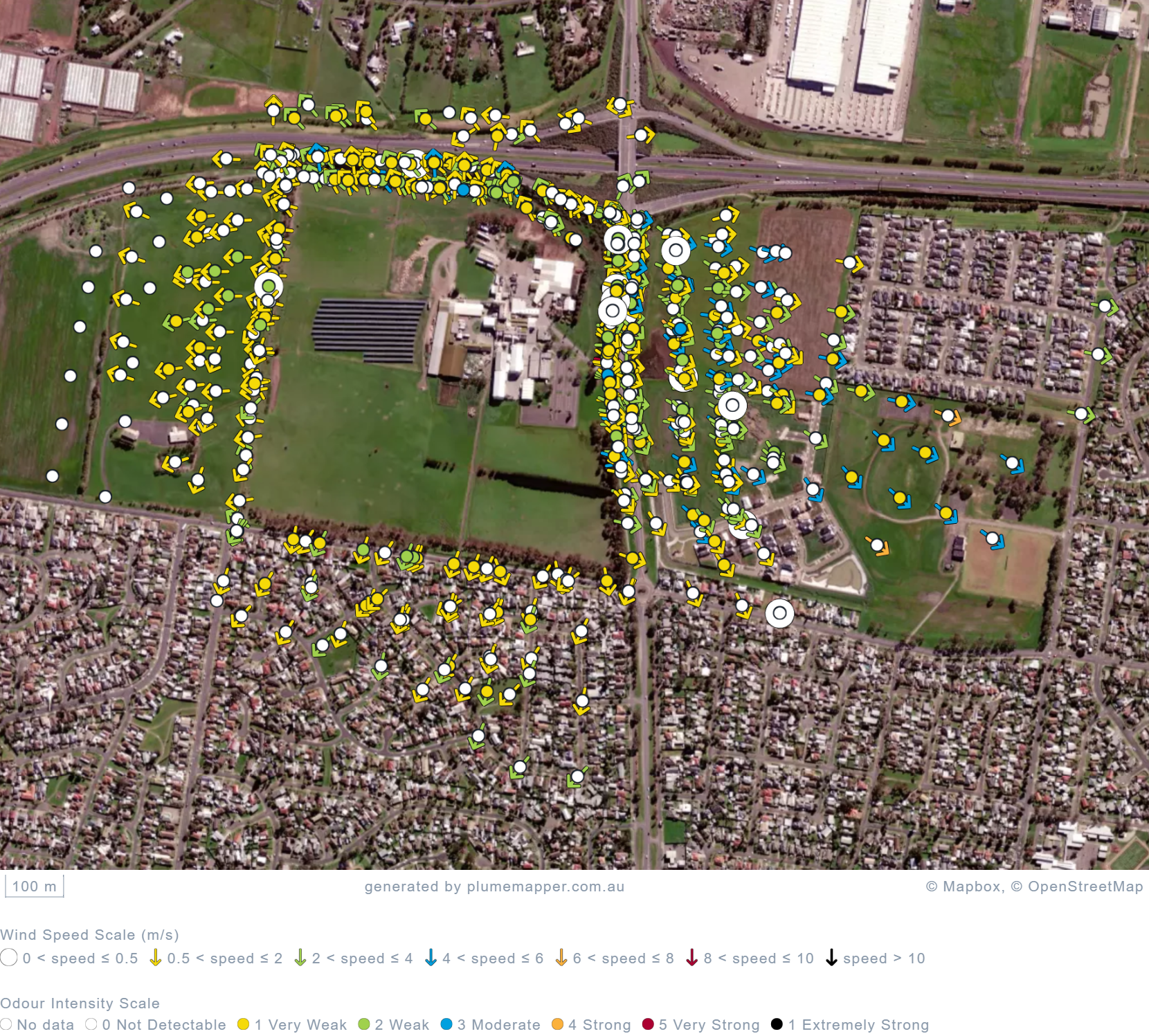 The project allowed us to fine tune the method and collect an enormous amount of data. We were doing the instantaneous measurement technique, constantly moving positions and taking measurements to track the plumes and map the ground level footprint. There were stack and fugitive ground level odour sources and the plumes often overlapped. I did develop fixed measurement points across the area and would return to the points each survey if within the plumes. The client thought the technique, and the data we reported, was wonderful.